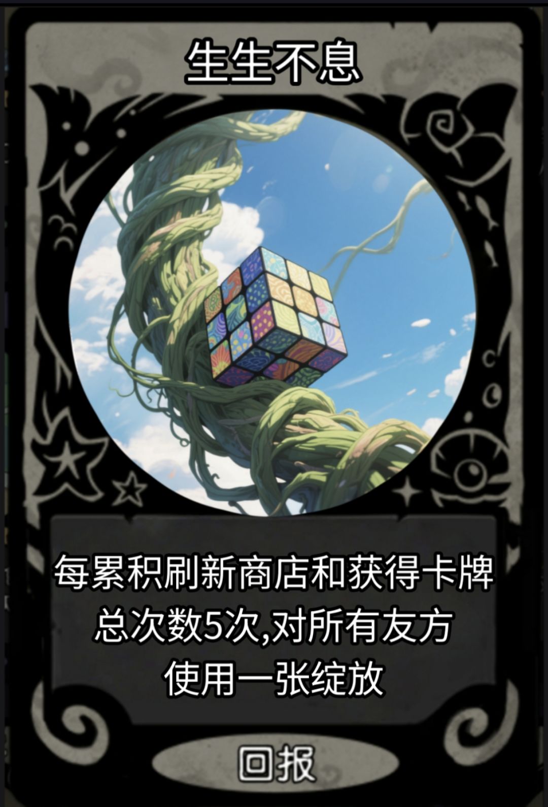 每累积刷新商店和获得卡牌总次数5次,对所有友方使用1张绽放。