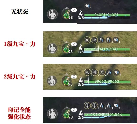 那么在官方的技能介绍中,我们并没有办法知晓九宝印记中的每一个印记具体的效果数值,不过根据实测,咱们这里以九宝·力这个提升生命的状态为例,给大家做个简单的数值测算。