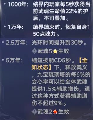 - 2.5万年魂环+黄色5星:在20秒大招护盾期间受到伤害时获得50点魂力,cd10秒,理论上每个大招护盾可以至多获得100点魂力
