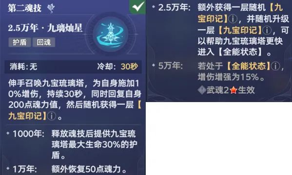 接着我们来说宁荣荣的普通魂技,此技能基础可以提供10%的增伤,持续30秒,然后直接回复200点魂力,并且随机获得1层“九宝印记”。