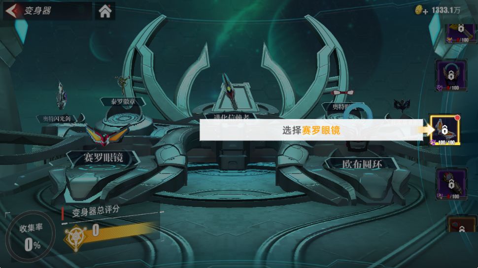 500勇闯奥传2(第十一天)上线依旧是老规矩开始收菜环节,把红点全部先点完,能领取的签到都签到,今天也是终于到达了45级也是开放了新功能变身器,开放功能会先进行一个新手引流进入变身器界面,直接会激活一个赛罗眼镜