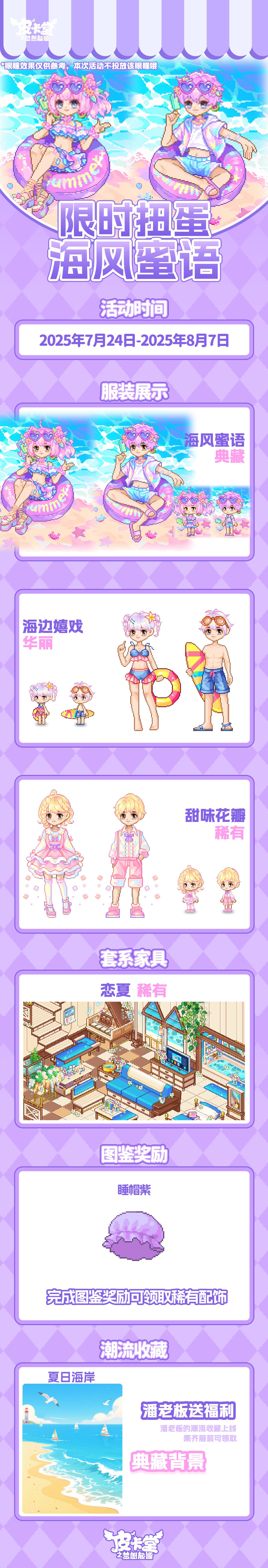 -【限时金币扭蛋】更新!参与可获得典藏套装「海风蜜语」、华丽套装「海边嬉戏」、稀有套装「甜味花瓣」,套系家具「恋夏」!收集服装可获得名片背景「夏日海岸」!完成图鉴收集任务可获得配饰「睡帽紫」!