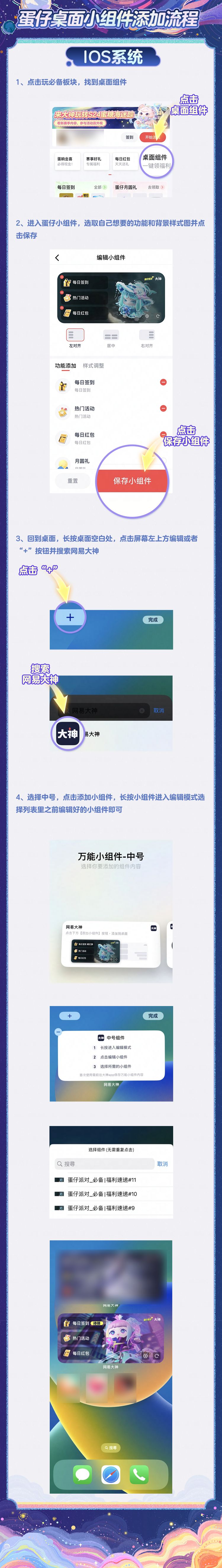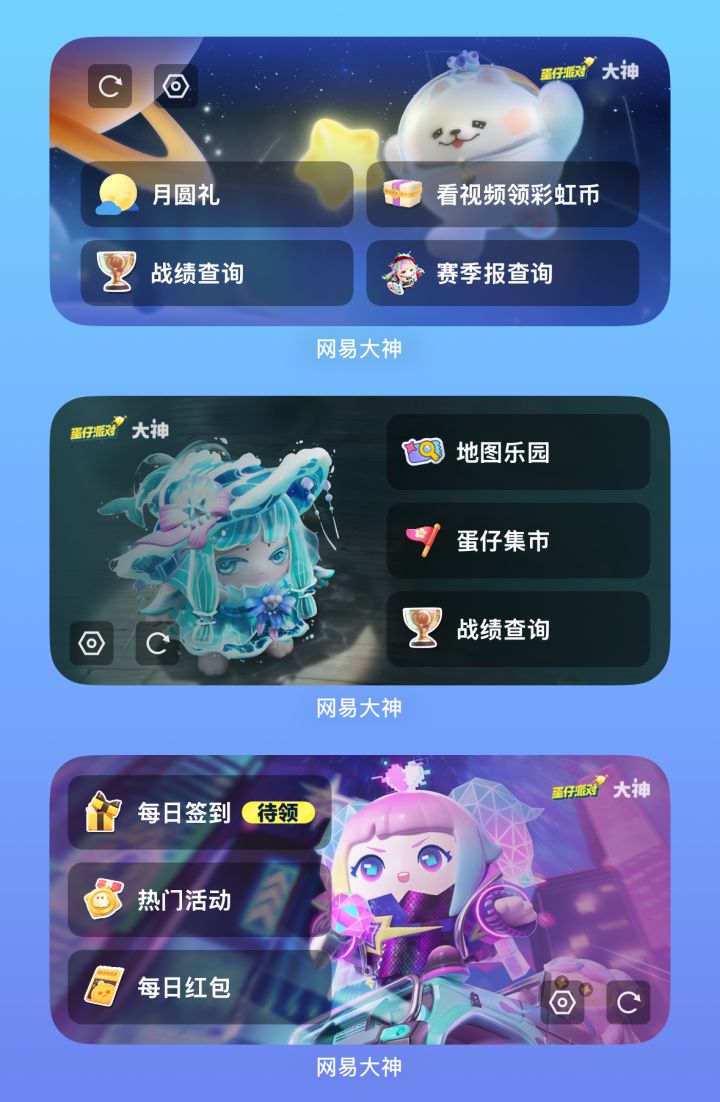 大神上新《蛋仔派对》小组件啦~在手机桌面一点,就能轻松领取每日福利!每日签到、热门活动、每日红包等功能一键传送!还可以自定义背景和布局哦~ 7月19日至8月1日,在蛋仔派对大神活动小管家评论区中晒出你的组件截图,还有机会获得彩虹币好礼哦!快戳图get皮蛋同款可爱桌面小组件吧!
