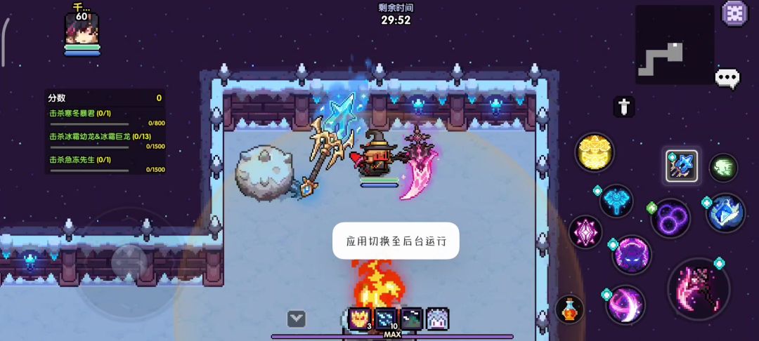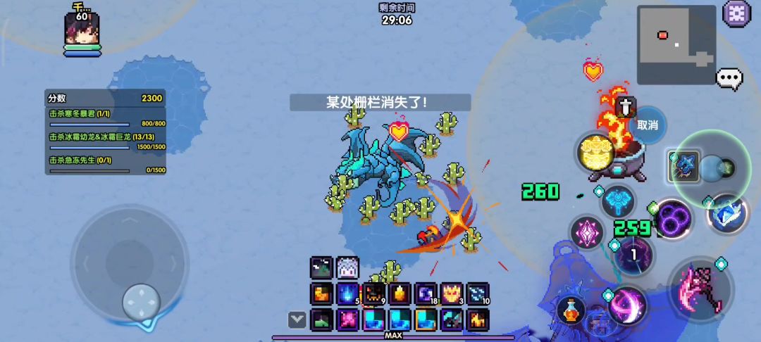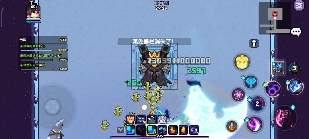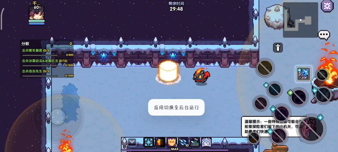 进入战斗后向左走,贴近墙面发光处点击普攻交互即可进入传送房间。与右下角雕像交互获得抗寒buff免疫场景冰冻debuff,与左下角传送阵交互即可传送至第一个传送点。出传送点向上走踩下格子可以解锁boss房内额外奖励箱子,然后向上走来到第一个boss处,击败寒冬暴君解锁额外奖励箱子。(此boss击败与否不影响挑战最终boss)
