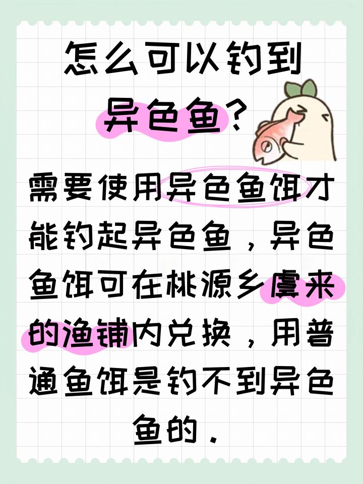 需要使用异色鱼饵才能钓起异色鱼,异色鱼饵可在桃源乡虞来的渔铺内兑换,用普通鱼饵是钓不到异色鱼的。