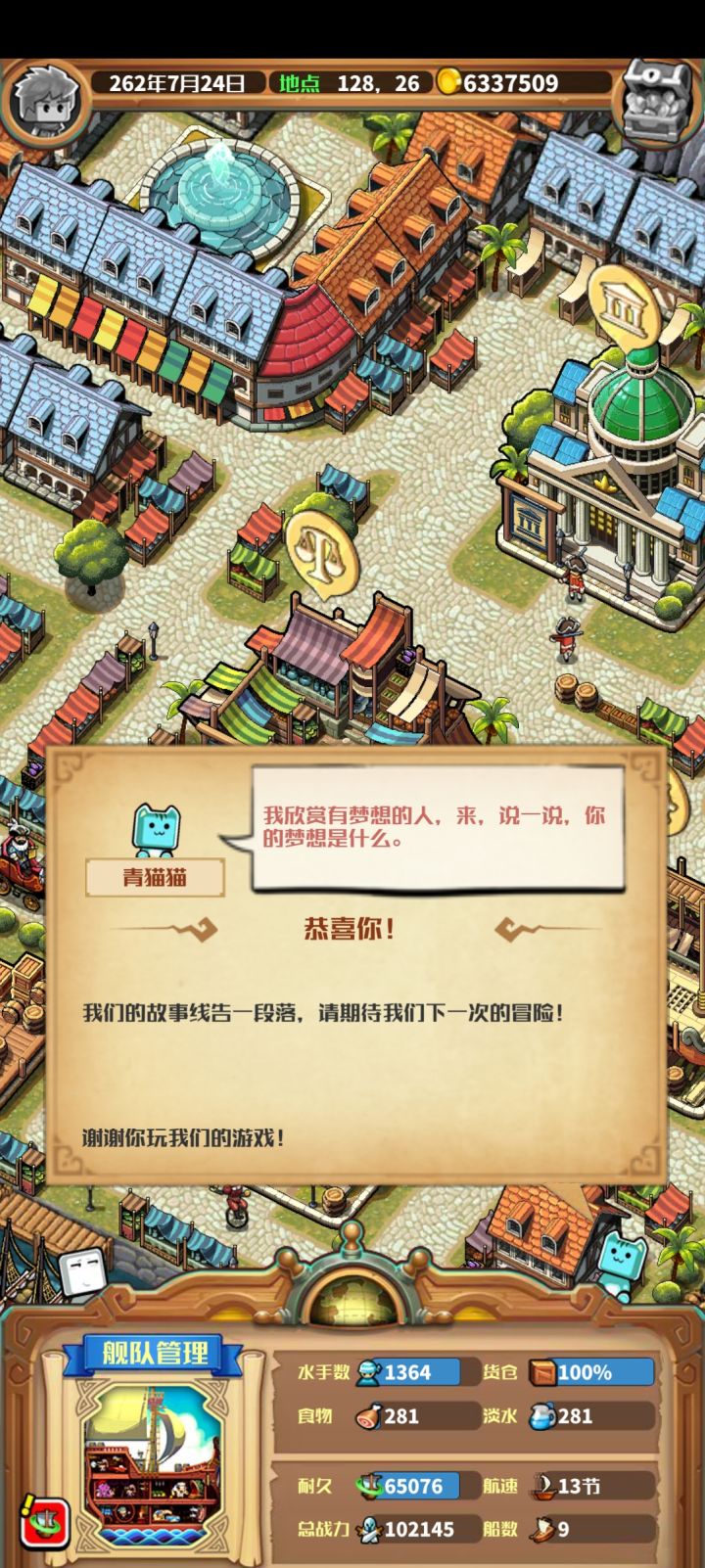 4️⃣最后说一下通关流程吧,前期材料较缺,基本都是靠捡垃圾和任务给的材料造船🌚也看了不少的攻略,前期直接宝蓝西南家具跑商,一路捡垃圾做支线,直接出两艘a货,然后过剧情到绯红,买绯红金银锡矿石到宝蓝东跑商,一次七八十万的利润😎,攒够钱和材料直接出郑和,顺带造一艘维多利亚过剧情😎,后续看需求再造郑和(我是造了两艘准备跑迷赤线,但两艘a货和1郑和就够了,但早造早享受吧),然后过剧情到迷雾,单郑和偷渡青海和赤海,准备跑迷赤线😌(迷赤线真赚钱啊,一趟往返全开黑市2000仓700w左右),赚够钱之后,一路开科技,利用任务给的材料和打绯红东北章鱼给的金造圣炮😎😎🧐有了圣炮(拉满,ss炮,海兽像凑合着用)后我们就有一定的战斗力了,先是加冰国该投资投资各国b c港打一打,后期就不缺材料了,但这次我不打算转国(懒),直接全图投资,但冰国缺龙晶、骨架,所以直接去打迷雾东北海蛇(单圣炮风筝)拿骨架出复仇,有了复仇可以打a港和s港了,而且跑迷赤更赚钱🌚,该打的打投资的投资(期间极度缺铁和银和铁锭,一直在刷)再打青海东北海蛇(风筝)拿龙晶,出胜利之后就可以通关了