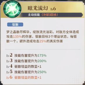 升满级的情况下,能对每个目标驱散5个增益,造成250%伤害,附带真实伤害。这就是莎皇恐怖的地方,无论你有多少增益,除了不可驱散的,基本是被扒光,而且专武四星又附带了驱散眩晕。