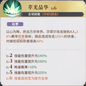 升满级的情况下,攻击全体,每个目标造成205%的伤害,每个目标40%概率眩晕,在小学二年级我们就学过,不考虑抵抗的情况下,一出手平均能眩晕2个目标,还附带了不低的伤害。