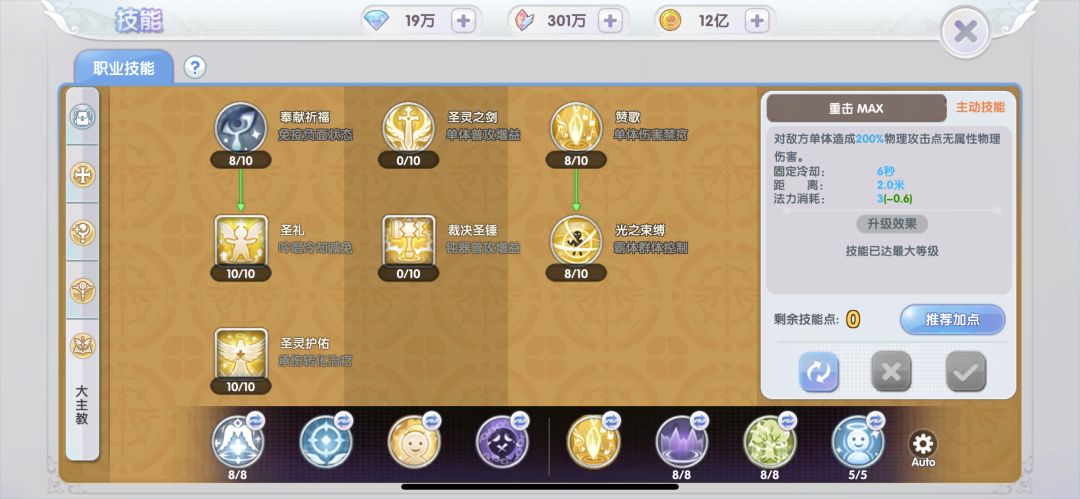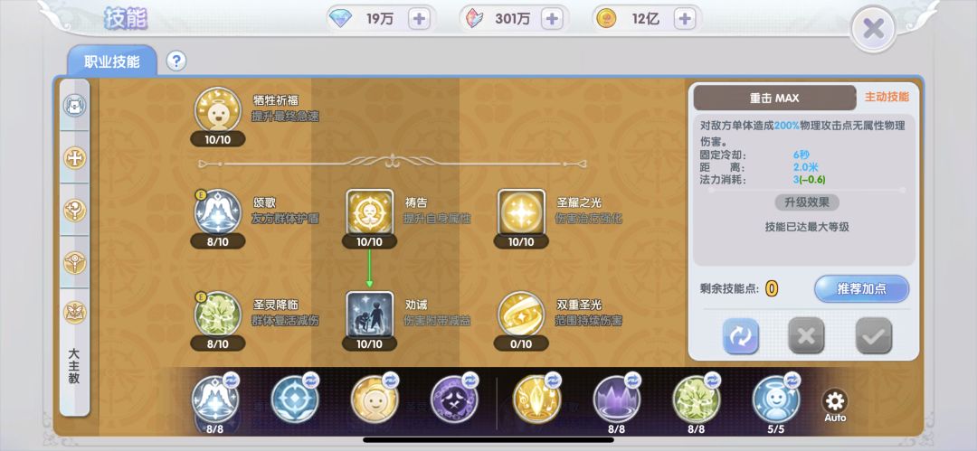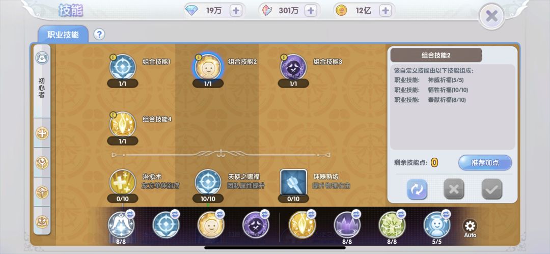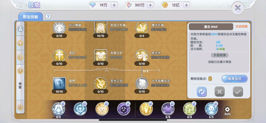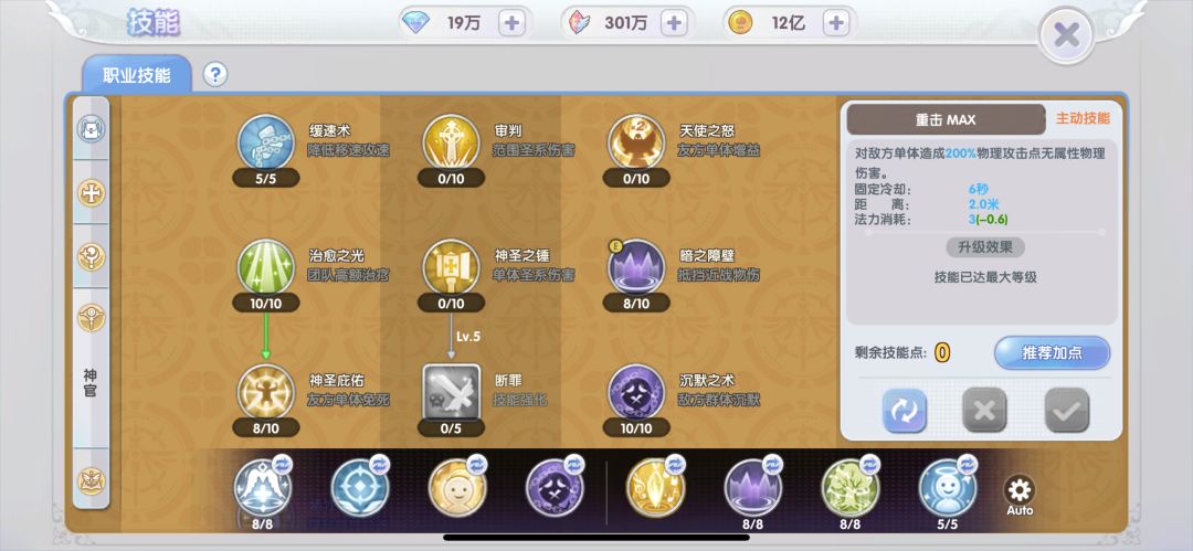3. 技能点富余时,优先投入 ,禅心、冥想、劝诫、缓速术、奉献祈福等“强力推荐”技能,大幅提升综合能力