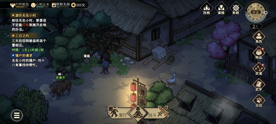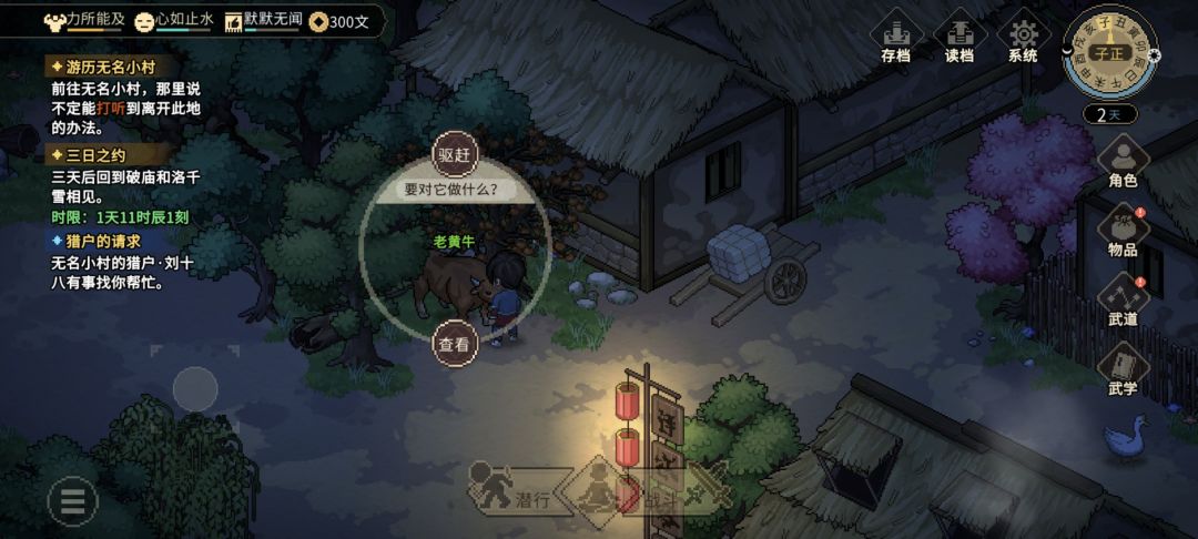 (2)前往无名客栈左边的[老黄牛]处,点击[老黄牛],选择 驱赶(不要杀它),然后在老黄牛站的位置,可以捡到:[蒲扇※武器/扇子]×1。