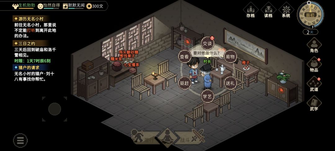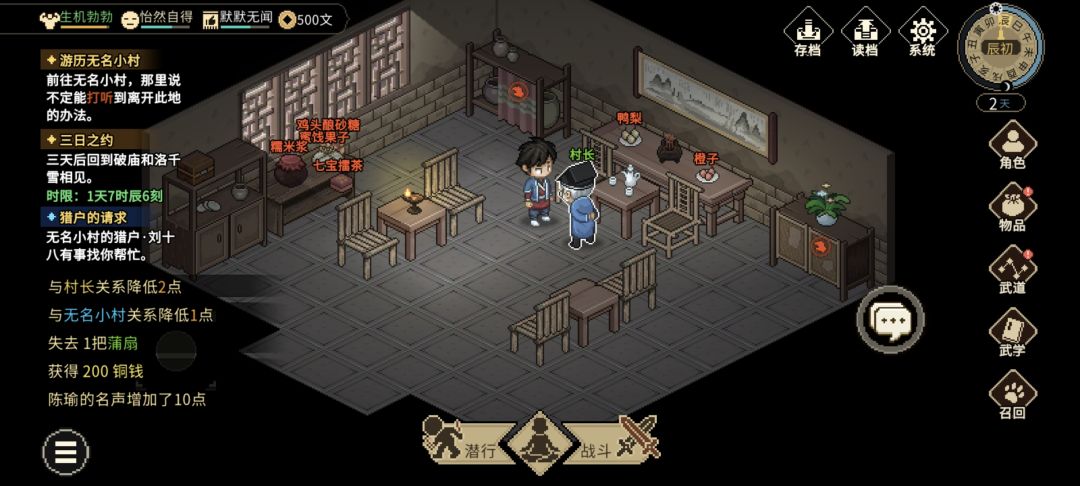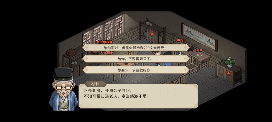 (1)提交【村长的蒲扇】任务的时候,不要选择选项①/③,都会扣村子关系(如下图所示),而且选了也就给200文钱,很亏的。