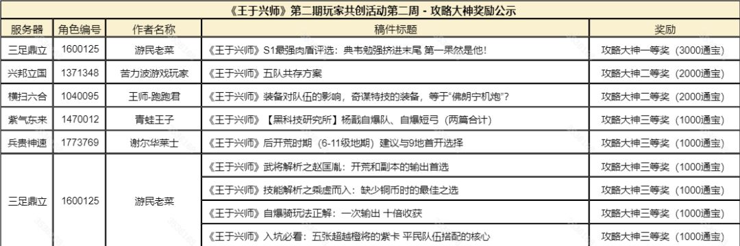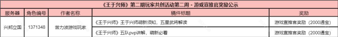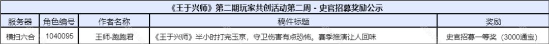 《王于兴师》第二期玩家共创活动第二周奖励公示