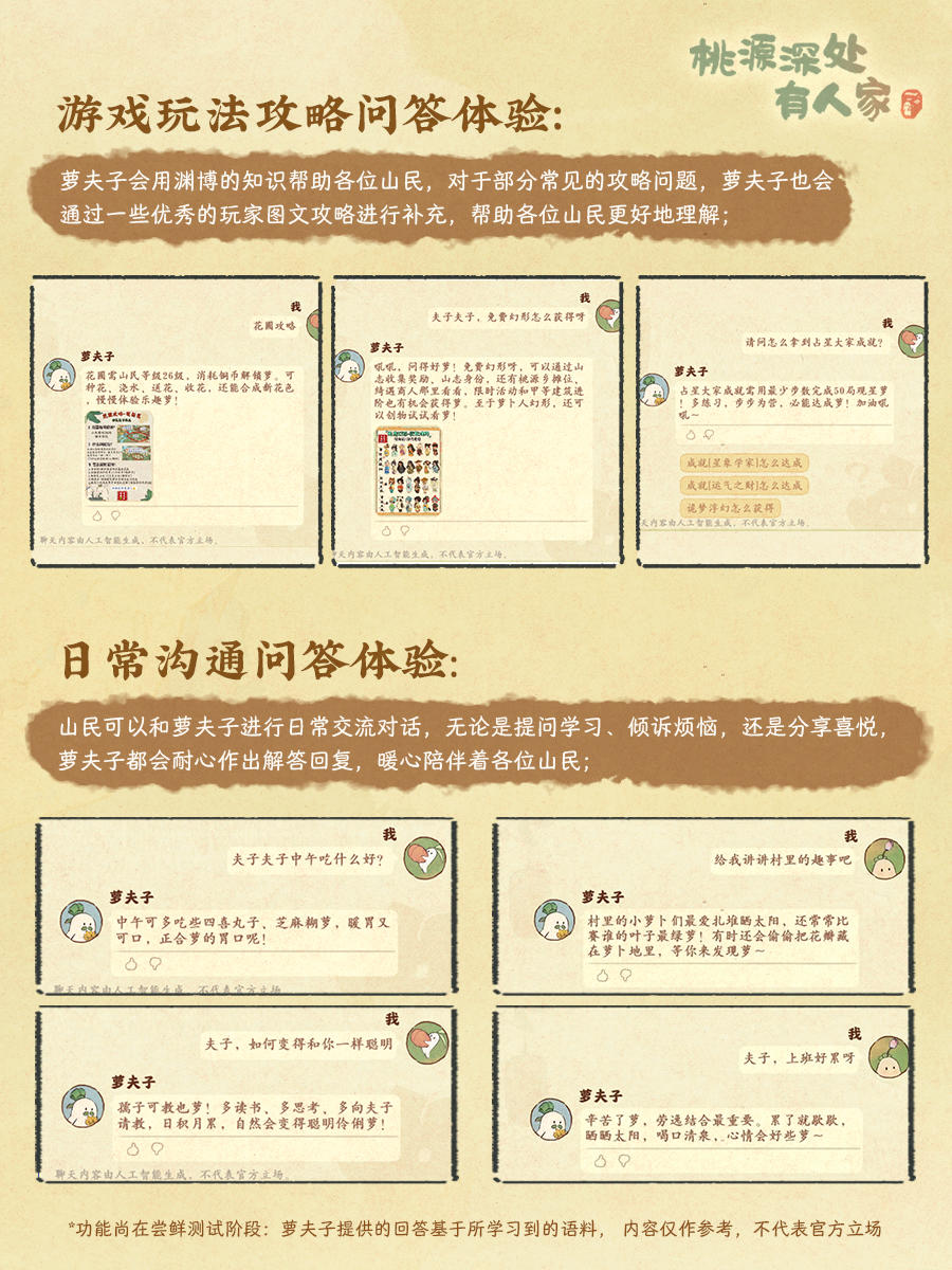 2、日常沟通问答体验:山民可以和萝夫子进行日常交流对话,无论是提问学习、倾诉烦恼,还是分享喜悦,萝夫子都会耐心作出解答回复,暖心陪伴着各位山民。