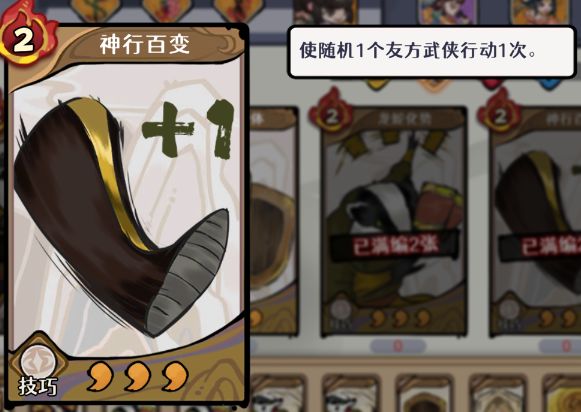 灵医的武学分两种效果,手牌较少时提供补牌,手牌较多时提供减费。3星武学就可以用1点怒气换3张手牌或两张牌减2怒,这个强度在所有紫色武侠中也是独树一帜了。能否灵活使用该武学一定程度上决定了行动流的上限。