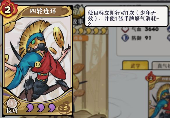 五轮的武学可以指定一个武侠行动一次,同时五轮1星可以解锁2星武学,带1点减怒,所以有能力的话可以拿下1星的金轮,会使怒气循环更加流畅一点。4星五轮则能够做到1费武学提供两点减费,但是前期不必强求,常驻等歪即可。