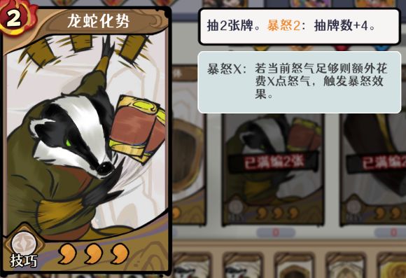 过牌则主要依靠灵医武学、龙蛇化势的暴怒和玄空掌的暴怒。我个人更喜好龙蛇化势,比玄空掌要低1点怒气消耗同时多抽2张牌。主要是后期行动流真的不缺玄空掌的这点伤害。