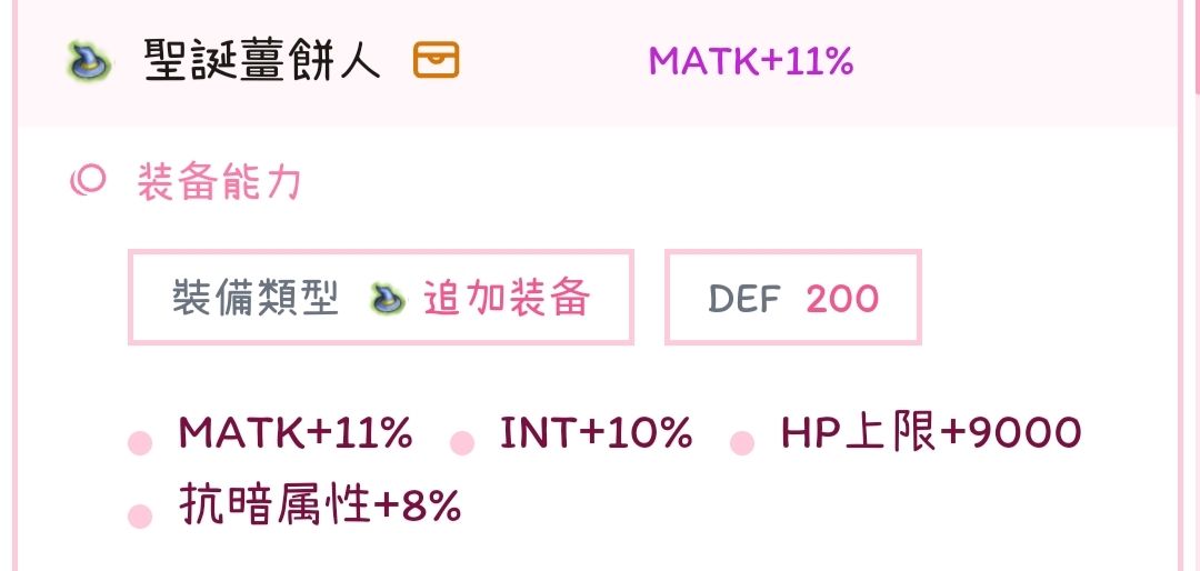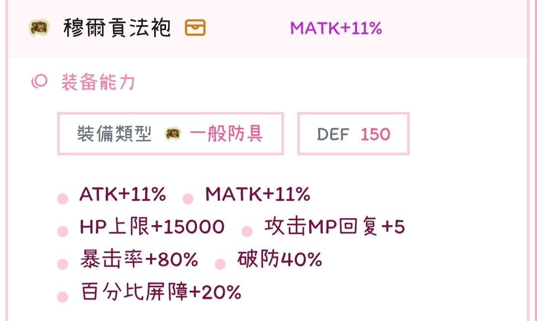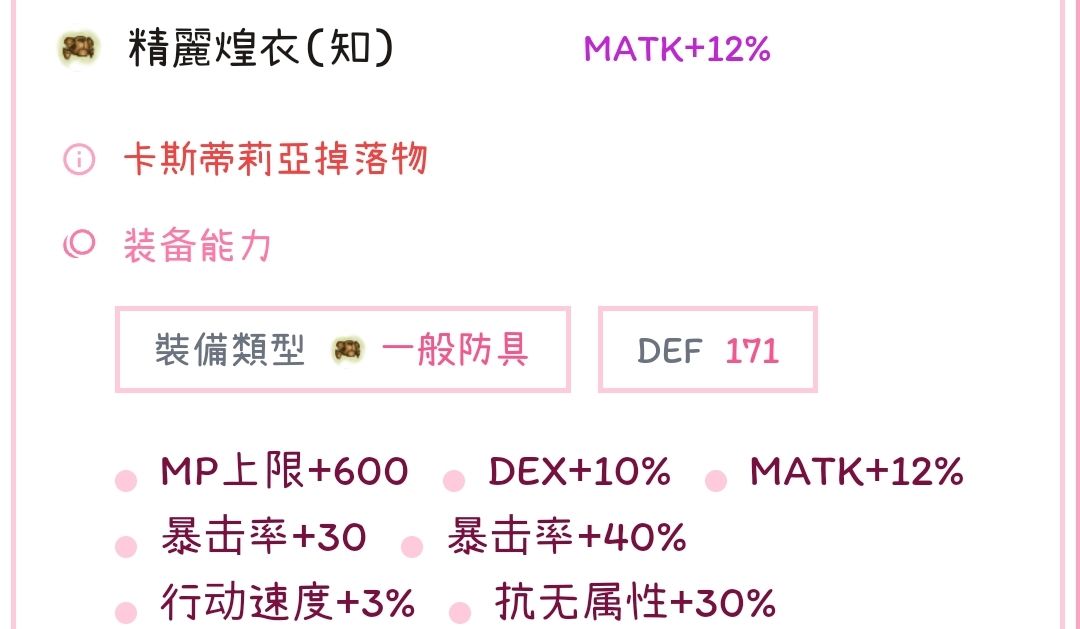 装备推荐:因为材料法面对的是小怪,以及法术技能暴击率的特殊性,所以装备词条matk%>hp=mp>其他,根据这个选择合适的装备即可