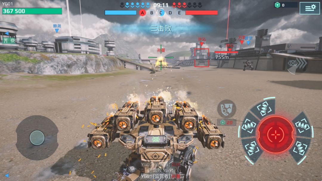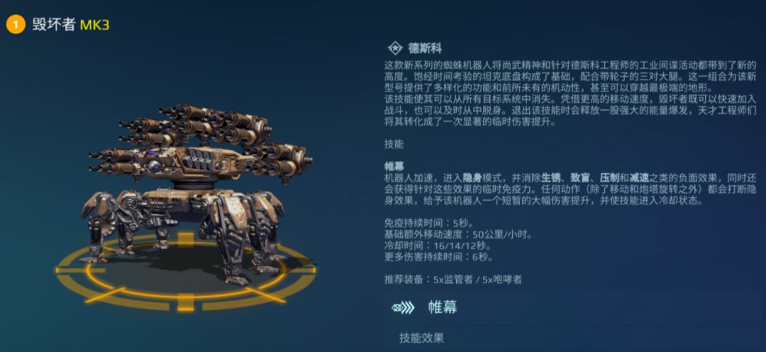 而拥有四门枪管的 [监管者],则是 “极致伤害” 与 “超远射程” 的完美结合体。它没有刻意针对 “肉机” 设计特殊机制,却能凭借自身强大的基础伤害,对所有类型的目标打出一致的高额杀伤 —— 无论对方是“脆皮机甲”还是“肉盾单位”,都能造成显著威胁。再加上其仅 8 秒的换弹时间,大幅缩短了机甲的火力空窗期,让持续输出能力更有保障。这种特性搭配上本身就具备 “隐身” 能力的 [毁坏者],几乎找不到明显的短板,可以说是中型机枪武器中的“最优”选择。
