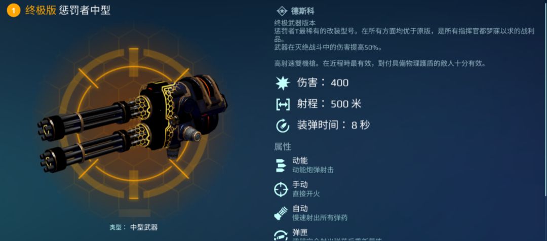 在目前的"中型机枪武器"中,[终极惩罚者] 有着两个枪管,射程达到 500 米。虽然其 DPS(每秒伤害)比 [监管者] 稍稍逊色,但它发射的射弹具备无视防御的特性,这让它能有效克制 “肉盾型” 机甲,尤其对[芬里尔]这类以坦度见长的机甲有着明显的克制效果。