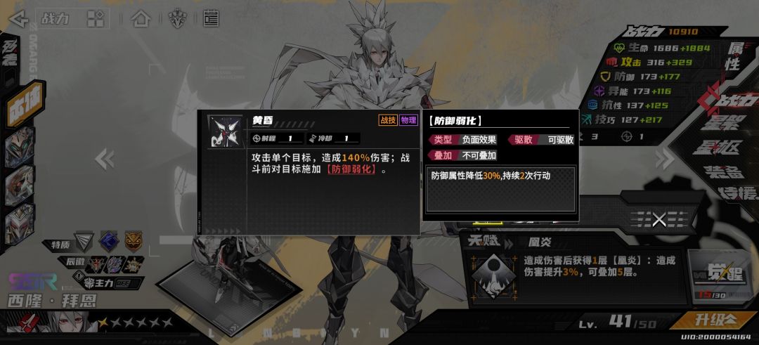 二形态,一技能对于处于地格上敌人无视抗性,被动永续减抗,节调有一回合隐匿,单点爆发不错但具有疲软期。