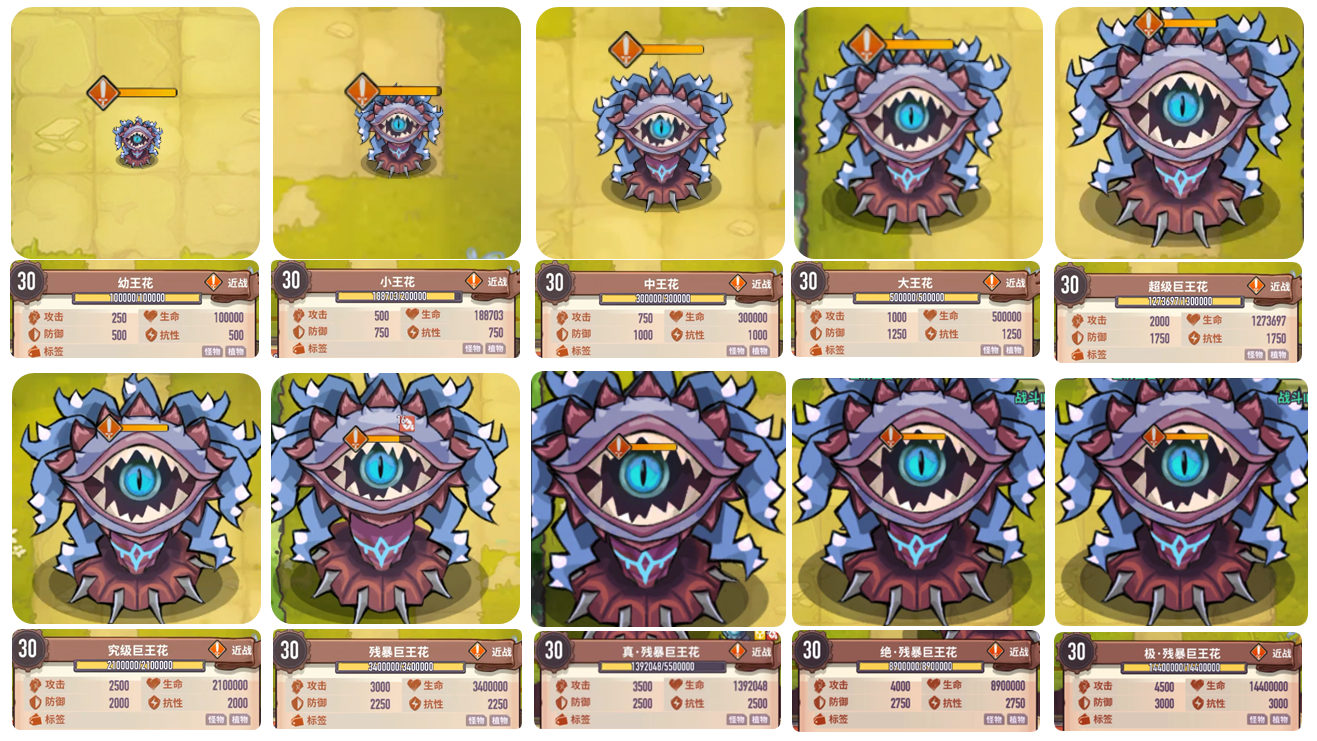 特点:幼王花击杀后在地图随机位置召唤触手,异界伤害仅计算触手受到伤害。回合结束触手在原位置变成幼王花进化体,进化体提升体型、血量和双抗,触手仅提升体型。