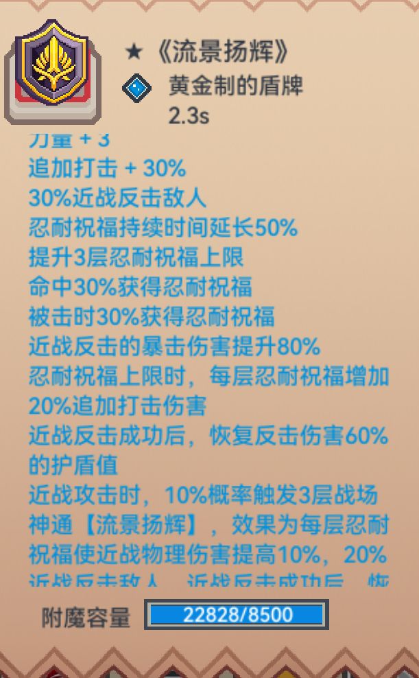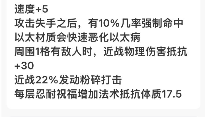 具体就是圣战流年的2层忍耐,流景扬辉的3层忍耐,自己本身有3层忍耐,2+3+3=8层。一层忍耐20抵抗体质。现在光忍耐就已经160抵抗体质,再搬出我们最后一件装备以太裂隙,他的效果是每层忍耐提升17.5法术抵抗体质,我们有8层就是17.5*8=140 140+160=300。等效150魔免了。