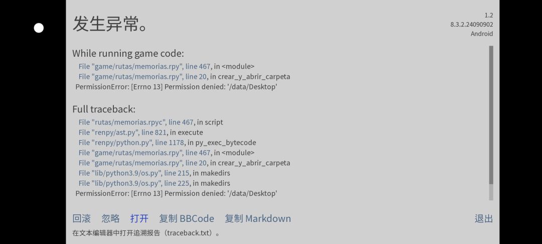 File "game/rutas/memorias.rpy", line 20, in crear_y_abrir_carpeta