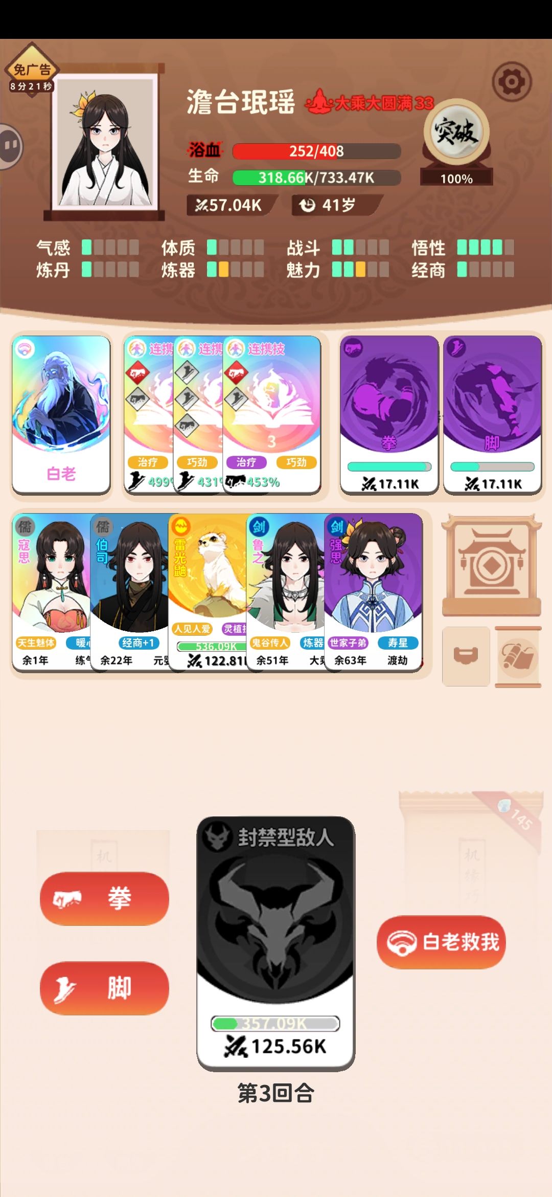 运气不好最后还是没找到第三个适合的连携技,但还是通关了,可以看截图,大乘圆满的小怪,也撑不过我第三回合的拳。