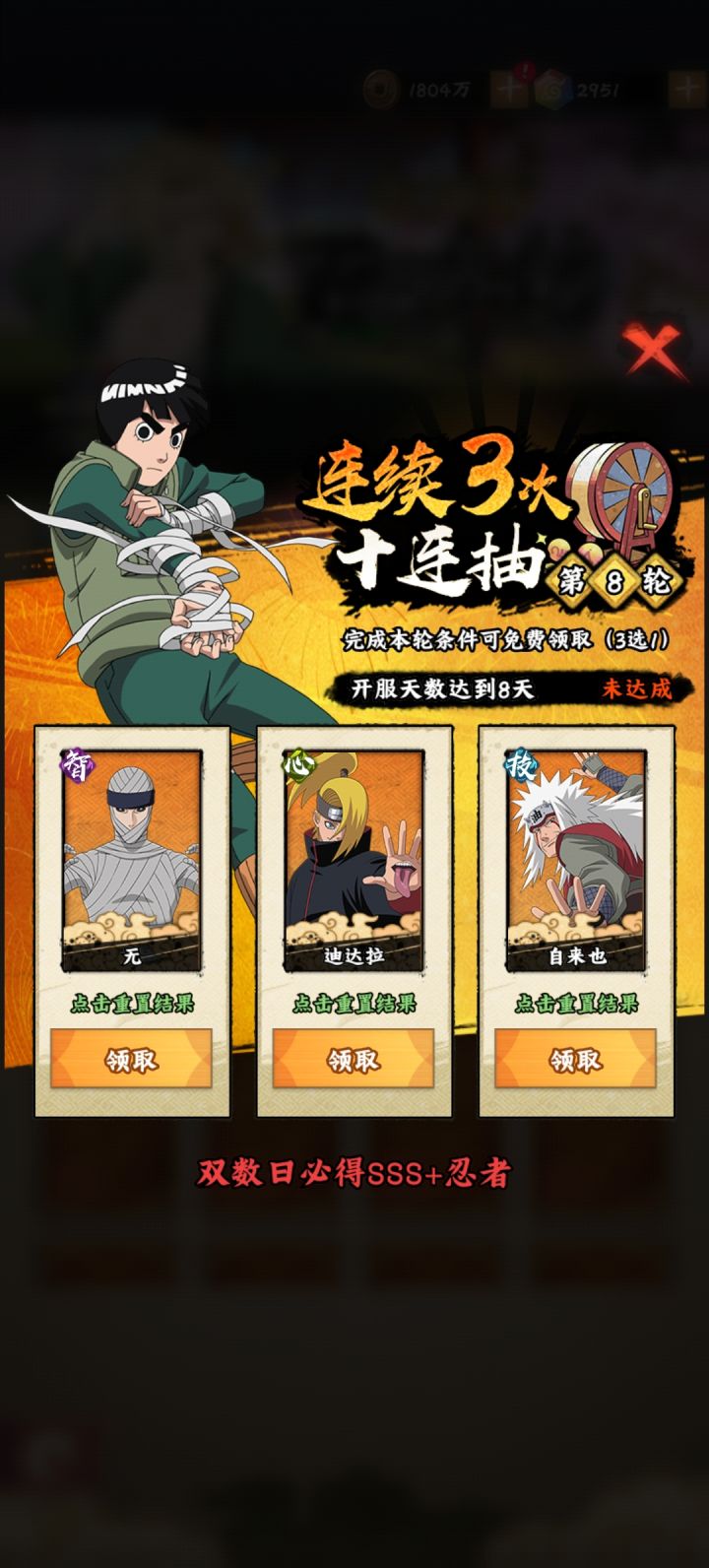 百忍集结:单数日必出SSS,双数日必出SSS+,能抽到纲手 雷影,再次证明他俩确实不行。真正的强卡会让你白票?对结果不满意可以重置,0-V5有1次,V6有2次,V8有3次,V10有4次,再高不清楚了。就先介绍到这。