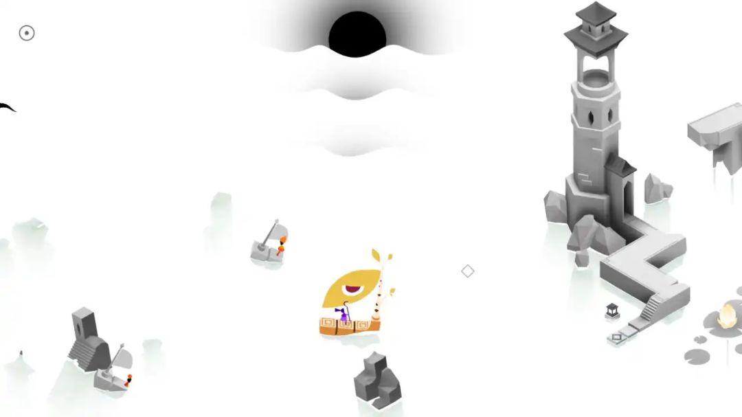 而在后续的关卡中,制作组积累许久的创意想法开始喷涌而出。首先出现的便是我们的老朋友——图腾,准确来说现在应该叫”船腾“,在这里它不再只是单纯的可动结构,而是化身船只,载着我们在一片梦幻的水域中,前往下一片地图,是的,《纪念碑谷3》中的部分章节不再局限于一图一建筑的传统,而是扩大到一个个箱庭地图中。