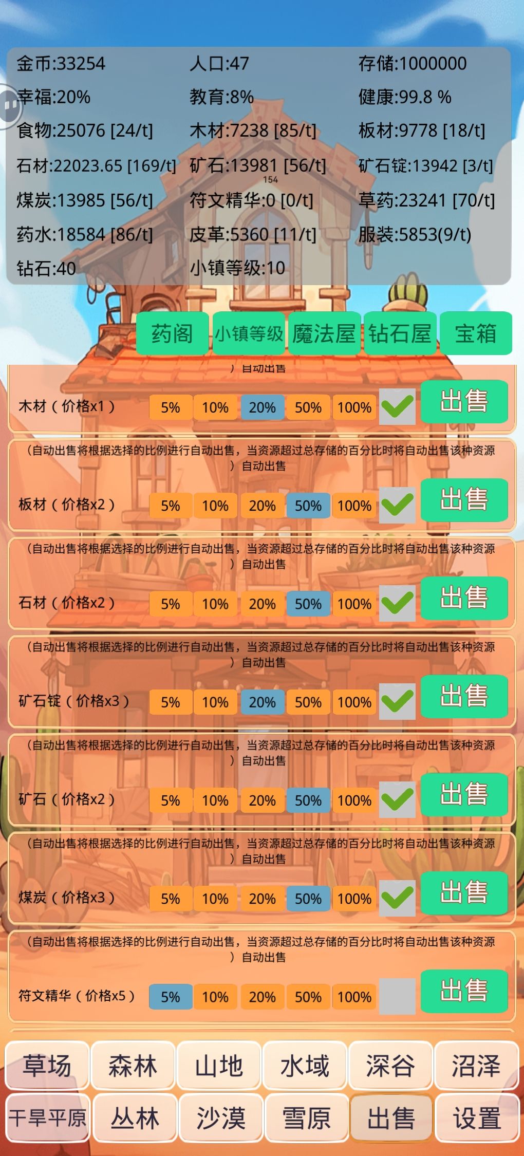 首先广告确实恶心,80%为摇一摇扭一扭的广告,10%正常10%为强制下载,钻石用作钻石屋提升游戏时间t产量(页面不显示但产出有加成),不建议换草药出售,起步升级山地矿工坑,留下石材,矿石煤矿全卖了,森林樵夫营地也要升级,不然木材跟不上,这是起步,自动恢复健康值要√,然后深谷这2个一有资源就升级,这是主要升级的项,产量跟不上消耗前期会出现离线负增长状况,因为游戏离线时间跟在线时间似乎不是同比,游戏时间应该是在线的几倍,具体不清楚。同时出售药水也是前期金币主要来源,因为前期建筑基本用不上,其他建筑资源多了可以适当升级#小镇经营农场模拟器 #心动小镇攻略