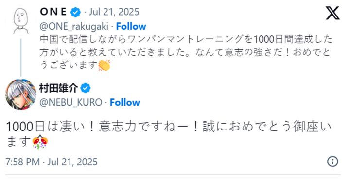 《一拳超人》原作者ONE在社群里发文祝贺:听说有人在中国直播,完成《一拳超人》训练法持续 1000天。意志力太强了吧!恭喜你👏。而村田雄介同样在下面回应:1000天真的超厉害!这真的是很强的意志力!恭喜你🎊#今天游戏圈发生了啥