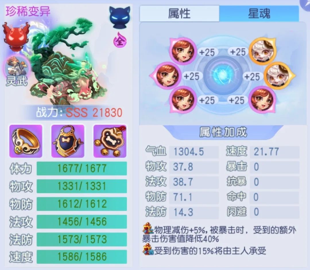 宠物属性属性以体质为主,轻微意志为辅。气血1.5万+,物防近2700,生存能力出色;速度840,能有效强化输出单位。