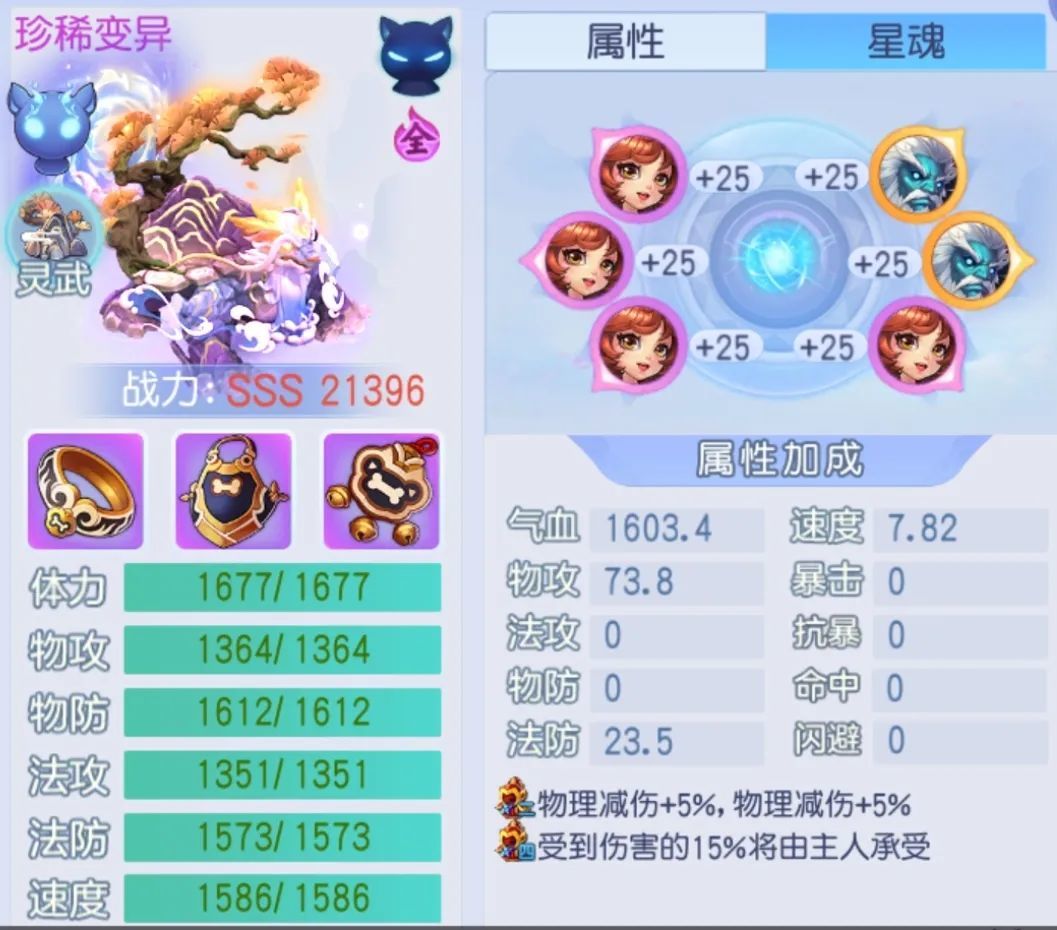 宠物资质成长值115全满,体力、物防、法防、速度资质全满,整体资质强劲。