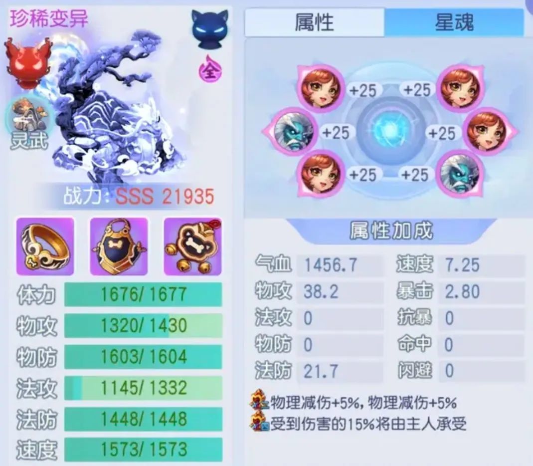 星魂1号位和2号位必带暴击和物攻,其余属性以气血为主。品质偏低,建议提升雪奴星魂品质至橙色,进一步提升属性。套装为鱼猫×4 + 雪奴×2,提供10%物理减伤,生存能力出色。但星魂与技能路线不一致,建议统一发展方向。