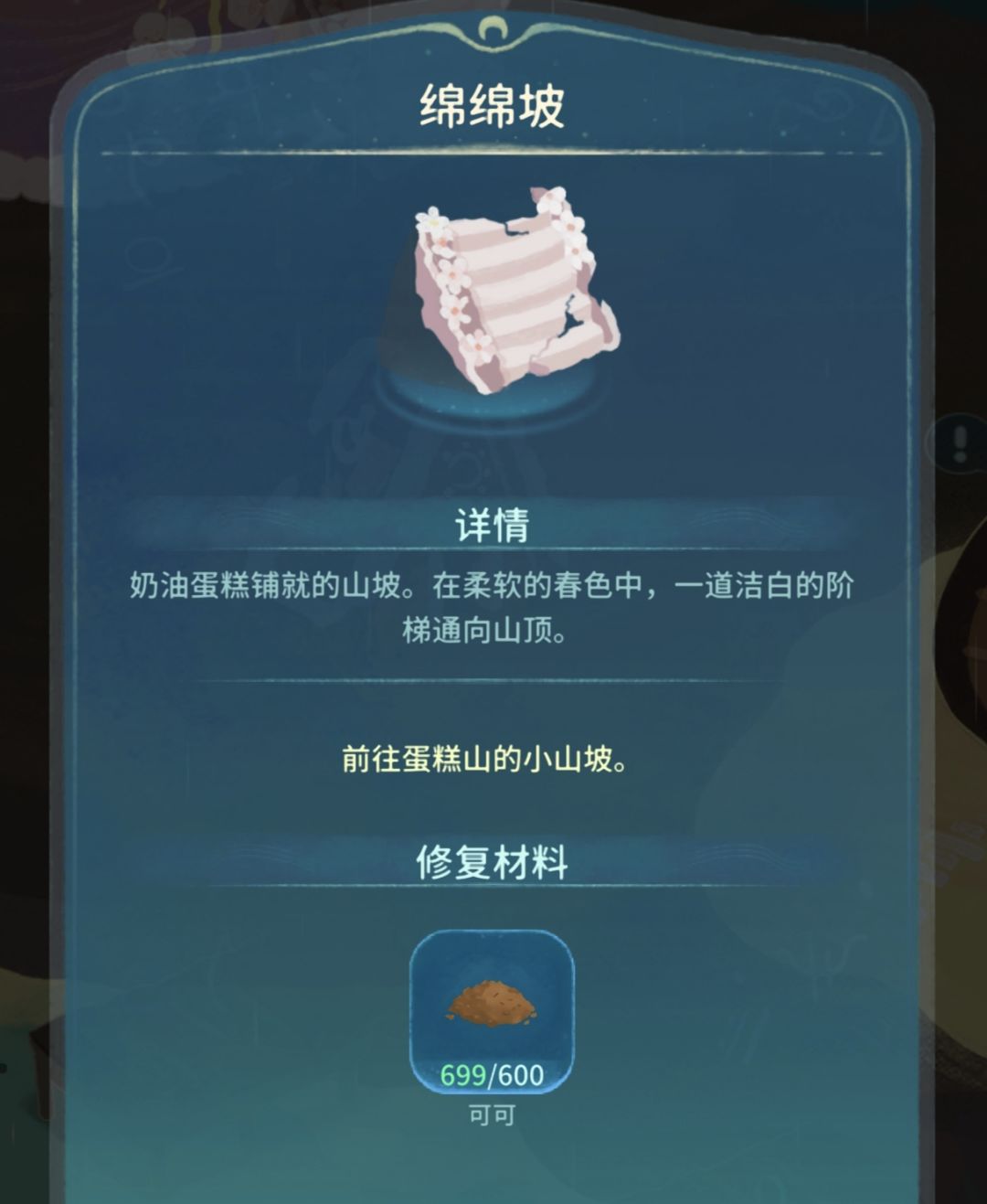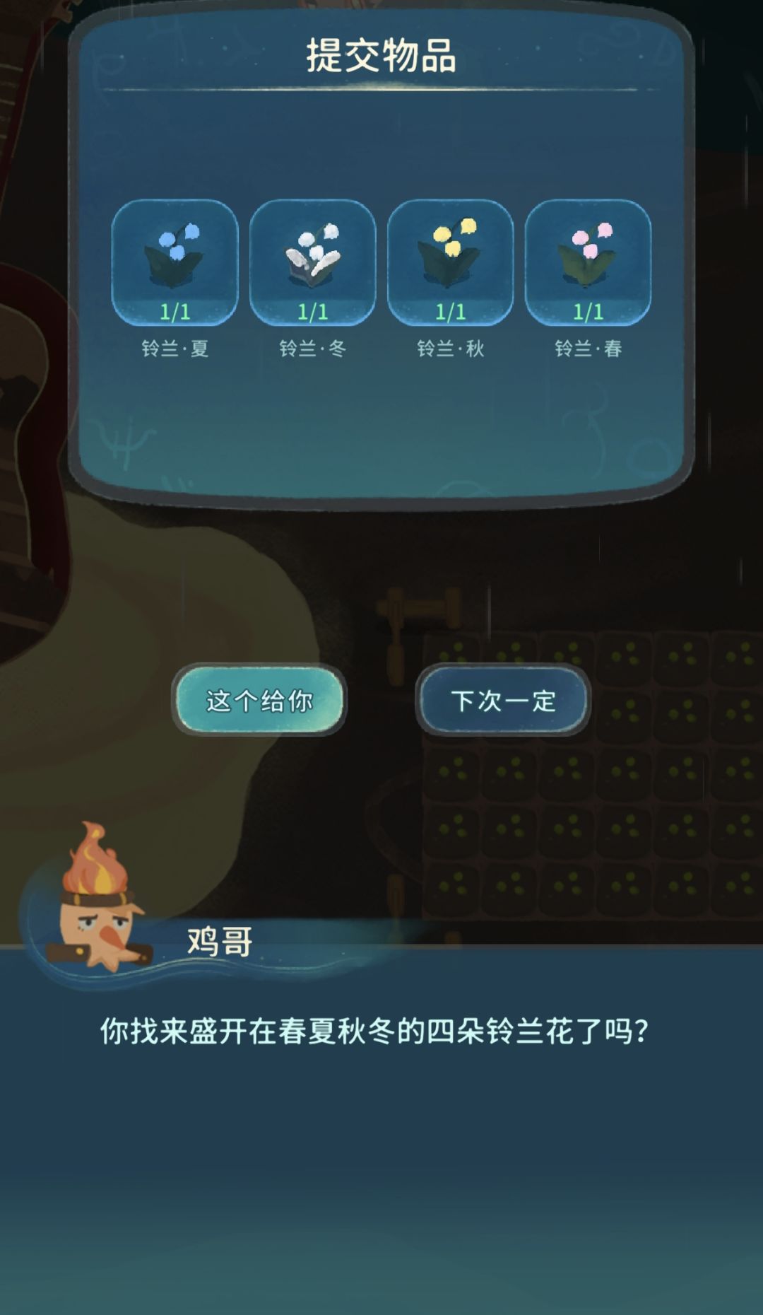 6.凑齐600个可可后,把森林之心重新种回面包森林继续攒木头,修复绵绵坡,开启新地图蛋糕山,进入地图后先清理杂物,然后种一株铃兰,注意不要在特殊天气种植,春天特殊天气为樱花雨,这里我叶绿素糖果比较多就直接加速了,凑齐四季铃兰就可以去找鸡哥先完成第一个任务了。