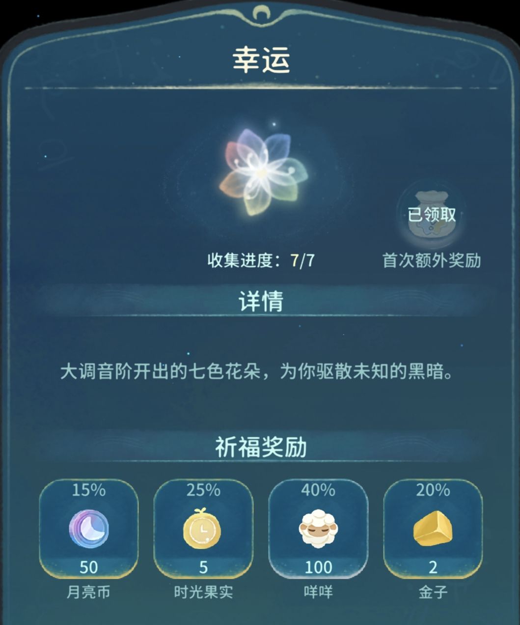 2.买完时光果实就开始刷搁浅,当同时满足咩咩≥300,呜噜之灵≥100,我们就进第二章开始治愈演奏,这里我运气非常差,差不多刷了20次才刷够100呜噜之灵。七色花每7片花瓣可以祈福一次,虽然奖励都一样,但是每章首次祈福都可以获得4个栅栏的蓝图。