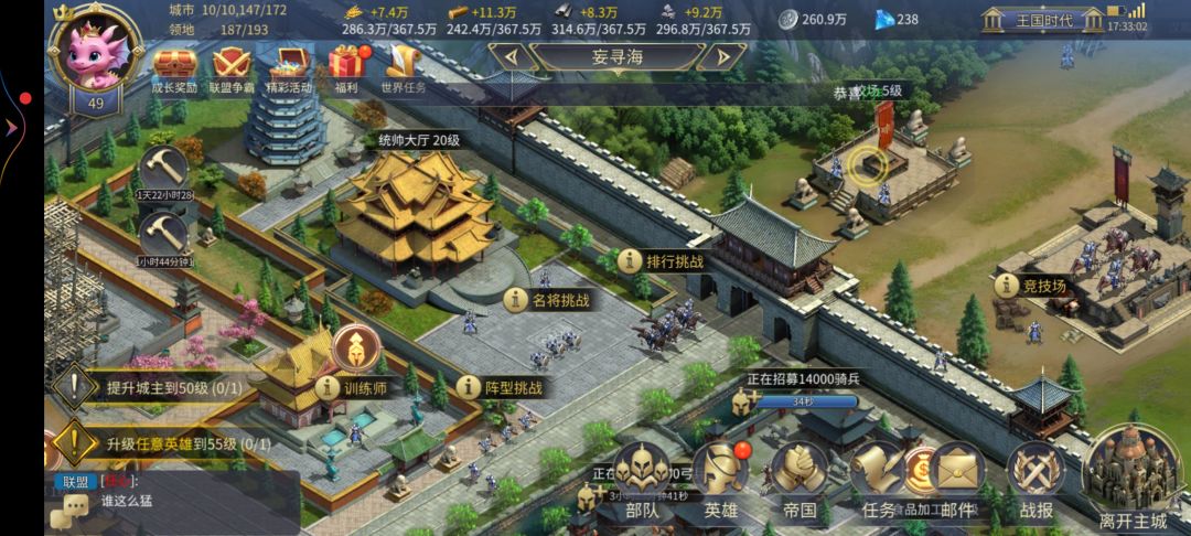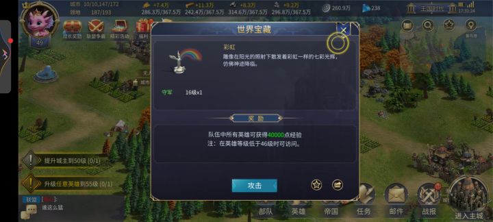 6.名城占领,名城是需要进联盟才能打的,打名城时,最好的是几个人一起打,不然体力会不够,花费的时间也多很多,占领名城能让你增加税收已经资源,可以在这个名城范围内不需要下附属就能打到别的地方.
