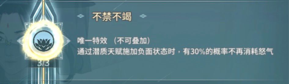 不禁不竭,如前文所提天赋施加负面可控性低,即使叠加该武道,依旧发挥不稳定,尤其控制种类多的门派更容易存在怒气或武道被“辣鸡debuff”浪费掉的情况,体验下来并没有脑测的那么美好。不过该武道配合负面数量单一且不存在真实抗性、持续供给高怒气的配置,或许仍存在开发空间?