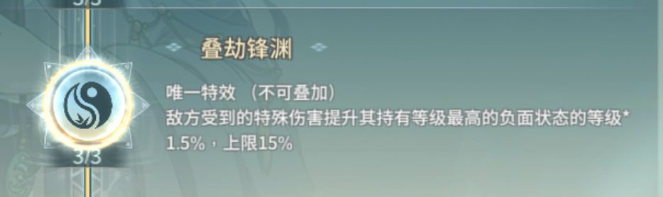 叠劫锋渊,描述为敌方受到特伤提升,故而全队均可吃到收益。debuff10级吃满15%加成,显然中毒是最容易吃满该武道的debuff,可以说是病机的定制武道。