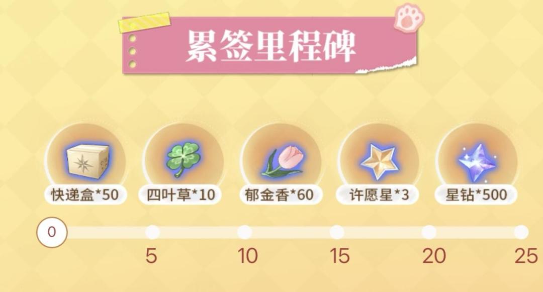 累计签到5、10、15、20、25天均可获得对应好礼。每个角色的累计抽签进度将在每月1号0点清空重置,主人别忘记喽~