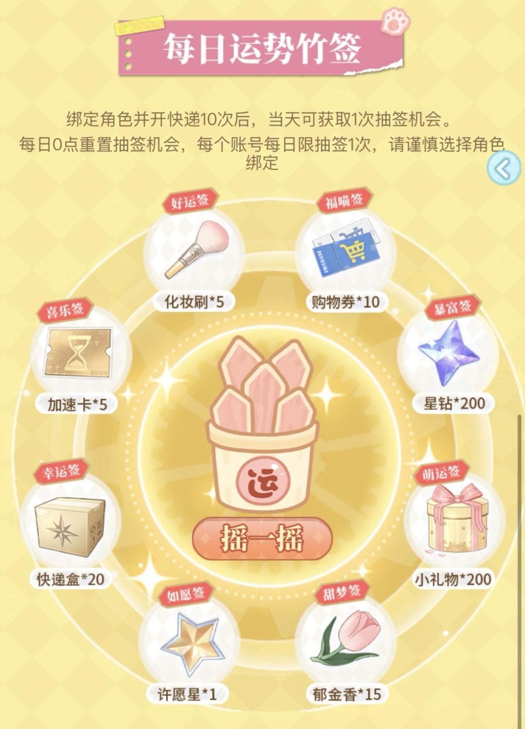 主人在游戏内开启快递10次后,即可获得1次抽签机会,次日0点机会将重置,主人及时使用哦~