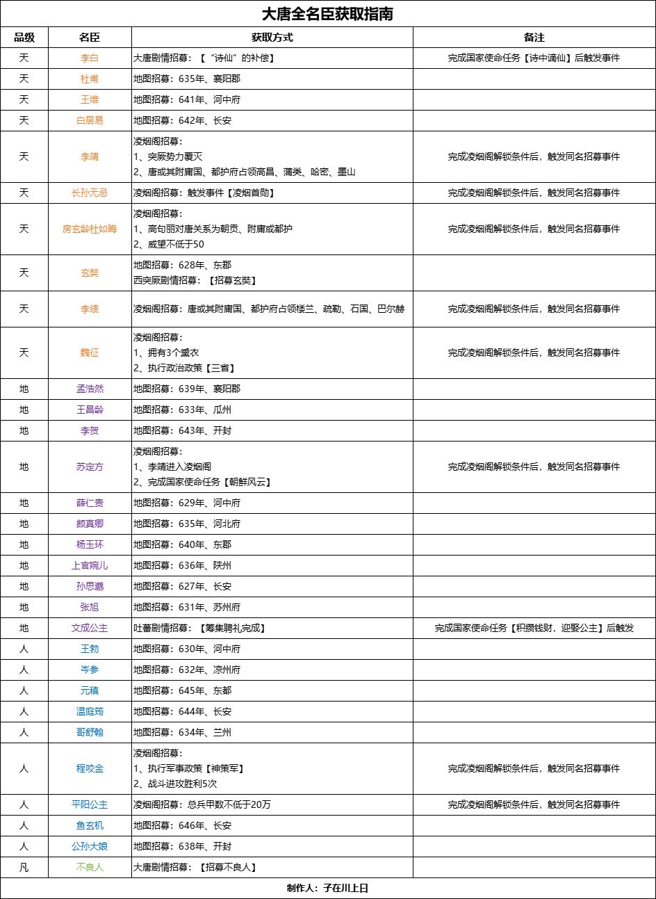 写在前面:各位王上好呀,我是子在川上曰。今天带来的是大唐名臣的招募表,本次大唐名臣的获取方式一共有三种,分别为
