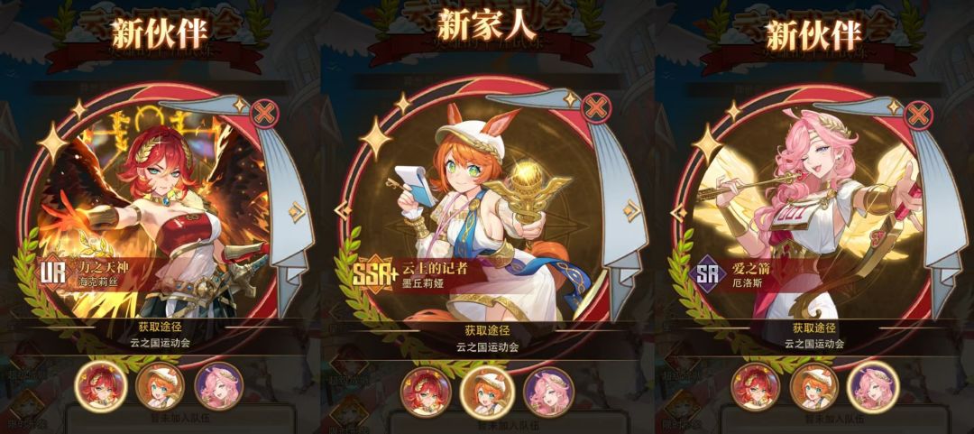 ur伙伴海克莉丝用积分获取碎片合成;ssr+家人墨丘莉娅是抽奖抽出来,sr伙伴厄洛斯在活动积分到达4.4w分时可免费领取。