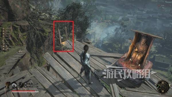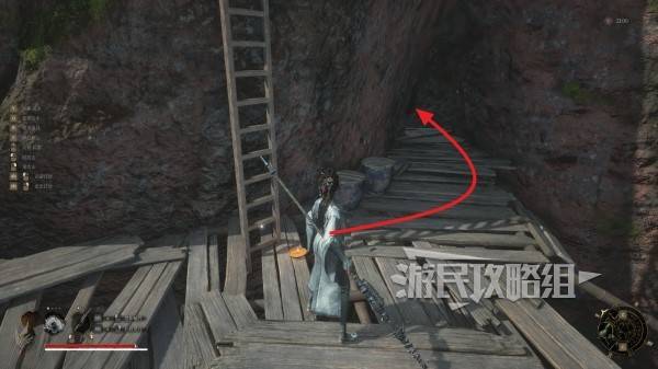 沿着山洞里唯一的路走到尽头,往下层看,可以看到一根斜搭的木头,下方还有怪,可以跳到木头上再往下层跳,下落过程中按轻攻击背刺下方的怪。然后继续往前方走。