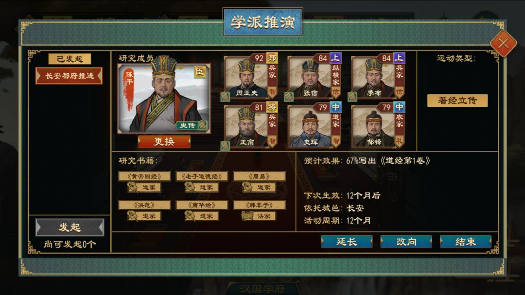 在新版本中,学派推演将开放著经立传功能,当势力达到圣人阶段,即可在学府中的学派推演设置研究成员并发起著经立传。著经立传成功后,会产生一本流派与势力主流文化一致的经书,在满足了王朝制度、九州统治力、诸子政策、经书数量等条件后,即可选择发起国族阶段改革。