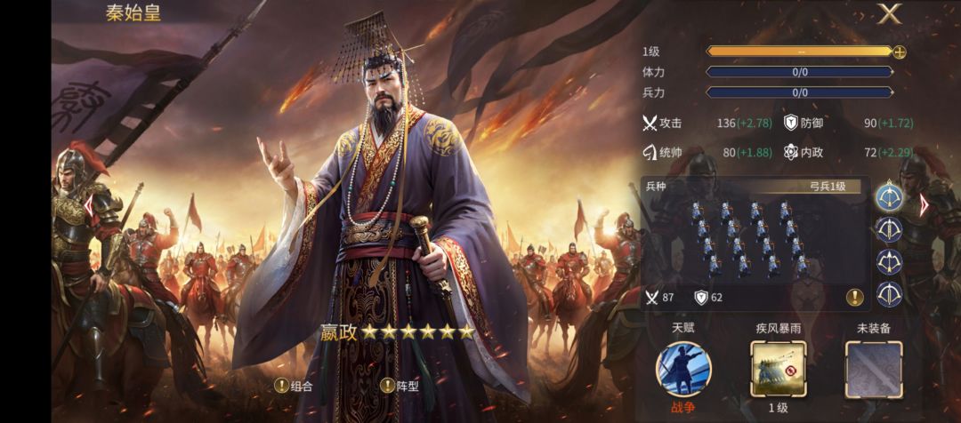 攻击135,仅比秦始皇第1个点,成长值2.66,比秦始皇要低一些,但依然很高的,防御92,统帅79,这两个数值都不错,和秦始皇不相上下,内政72倒是跟秦始皇基础数值一样,但成长值要更低一点。从数据看,强势!没有明显短板!