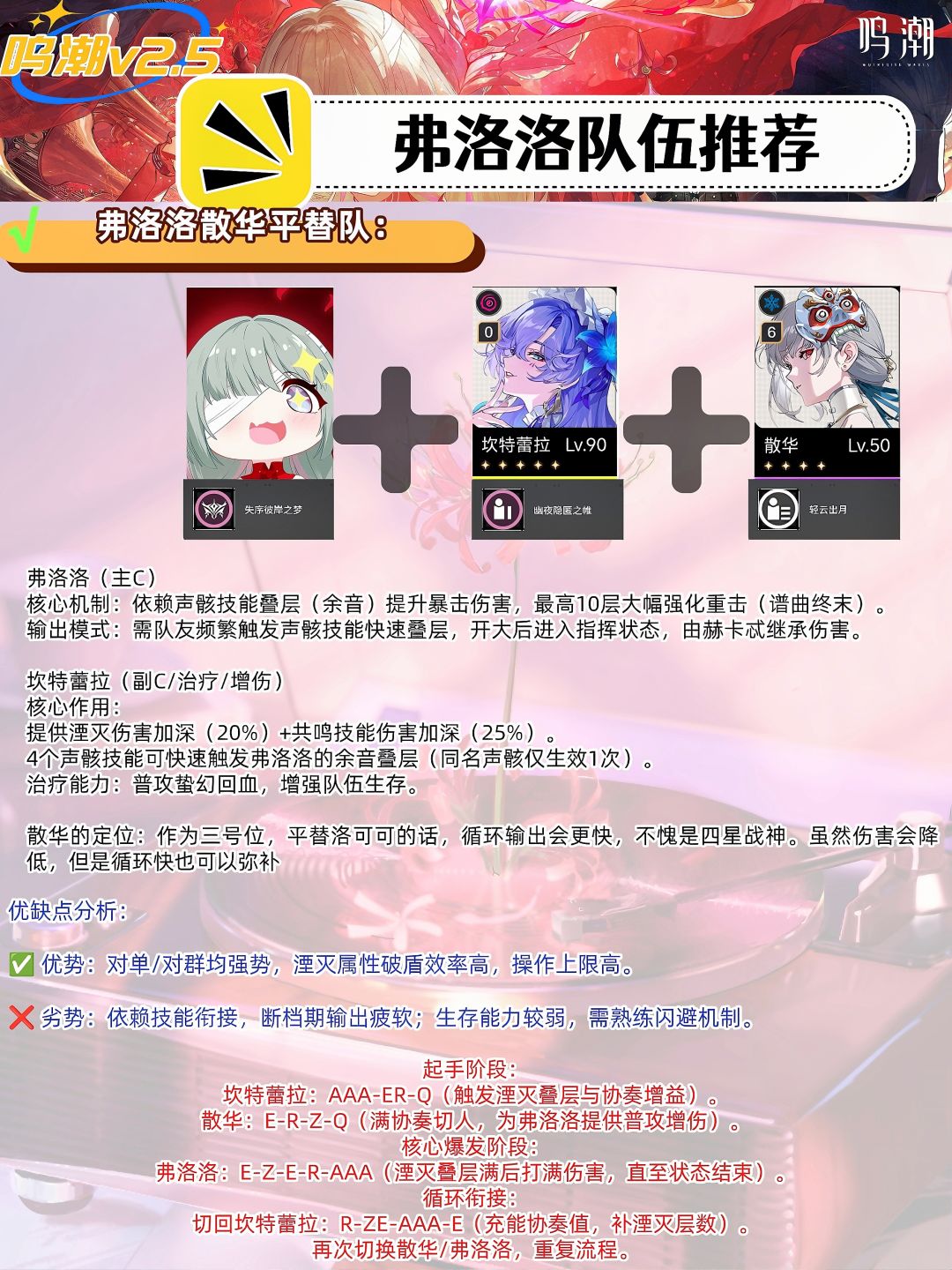 属性联动:弗洛洛作为湮灭属性角色,优先搭配同属性角色(如坎特雷拉)触发叠层增益,最大化输出。