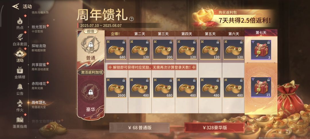 - 拾光签到:7月10日-8月7日,完成每日签到任务即可获得累积35个宝箱,其中有30个是最新的灵玉宝莲,5个为自选宝箱。