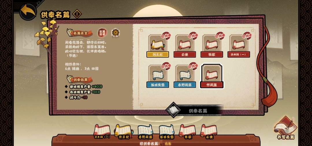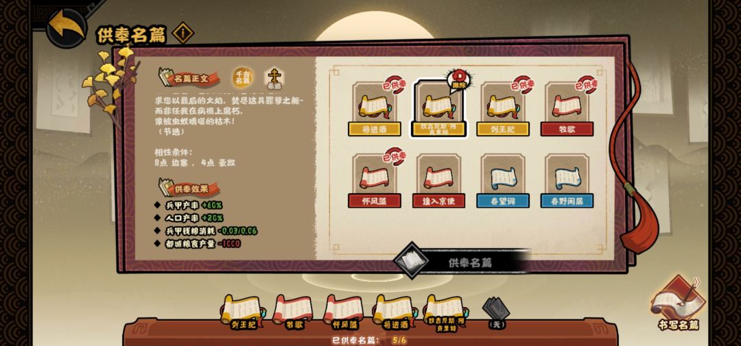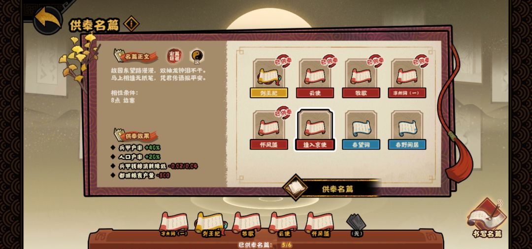 接着是名篇系统,名篇中最好的是金色的千古名篇,需要最高相性达到11,或者最高的两条达到8和4,第二好的是鸿篇巨著,需要最高相性达到8,或者最高的两条分别达到6和3。所以制作名篇需要的是相性一致,只需要两种相性最高的才能达到最好的效果。但是有些相性天生不合,即使你达到相应的数值也不会给高级名篇,比如边塞和田园,豪放和田园等。